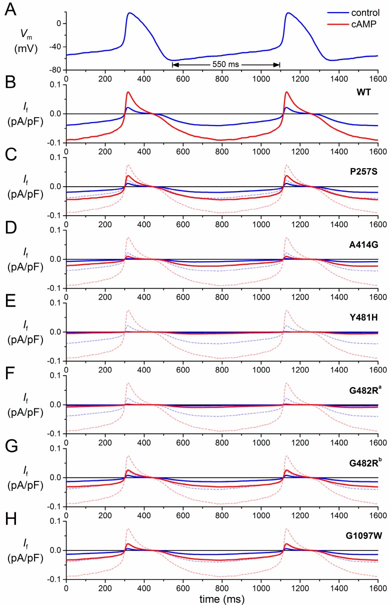 Figure 3. Effect of mutations in HCN4 on If in a human SAN pacemaker cell assessed by simulated action potential clamp. (A) Action potentials recorded from a human SAN pacemaker cell used for action potential clamp; (B) computed wild-type (WT) If of a human SAN pacemaker cell during the action potentials of (A) under control conditions (“control”, blue line) and upon adrenergic stimulation (“cAMP”, red line); (C–H) computed If of a human SAN pacemaker cell carrying heterozygous mutation in HCN4, as indicated, during the action potentials of (A) under control conditions (solid blue line) and upon adrenergic stimulation (solid red line). Wild-type If of (B) under control conditions (dashed blue line) and upon adrenergic stimulation (dashed red line) are shown for reference. G482R traces, labelled “a” and “b”, are based on data from Milano et al. [27] and Schweizer et al. [28], respectively.