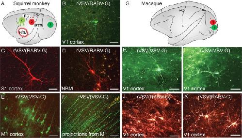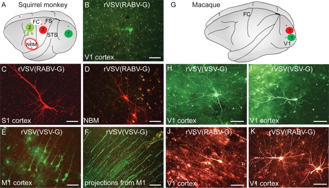 Figure 8. rVSVs can infect squirrel monkeys and macaques. (A) Schematic drawing of a squirrel monkey brain, indicating location of the injection sites in primary visual cortex of monkey #1 (dark green), in the motor cortex (light green), and in the somatosensory cortex (red) of monkey #2. Arrows indicate projections originating at the site of the motor cortex injection, small red and green dots represent retrogradely labeled neurons from the sites of somatosensory and visual cortex injections, respectively. The area demarcated by the red oval corresponds to the nucleus basalis of Meynert (NBM) (B) A GFP‐expressing neuron in the visual cortex after injection of rVSV(RABV‐G) encoding GFP into the primary visual cortex in monkey #1. This pyramidal neuron is located ∼3 mm dorsal to the injection site and is presumably labeled by retrograde uptake of the primary inoculum. (C,D) Neuronal labeling by presumed retrograde uptake after injection of an mCherry‐encoding rVSV(RABV‐G) into the primary somatosensory cortex in monkey #2. (C) Labeled pyramidal neuron in cerebral cortex ∼3 mm dorsal to the injection site. (D) Presumptive cholinergic neurons in basal forebrain nucleus of Meynert. (E,F) Results of the injection of rVSV(VSV‐G)‐expressing Venus into the primary motor cortex of squirrel monkey #2. (E) Labeled pyramidal neurons and interneurons at the injection site. (F) Venus was seen in the axons originating from the infected neurons at the injection site, projecting away from cortex into the white matter going towards internal capsule. (G–K) Labeling of cortical neurons after rVSV injections into the primary visual area in a macaque monkey. (G) Schematic drawing of a macaque brain showing injection sites of rVSV(VSV‐G) (dark green) and rVSV(RABV‐G) (red) in the primary visual cortex. Small red and green dots represent location of rVSV(VSV‐G) (green) or rVSV(RABV‐G) (red) labeled neurons from the sites of somatosensory and visual cortex injections (H,I) Labeled neurons near the site of injection of rVSV(VSV‐G) encoding Venus into V1. (J,K) Labeled neurons near the site of injection of rVSV(RABV‐G) encoding mCherry into V1. FC = central fissure; FS = Sylvian fissure; NBM = nucleus basalis of Meynert; STS = superior temporal sulcus, V1 = primary visual cortex. Scale bars = 50 μm in B,C,E,G–J; 100 μm in D,F. |