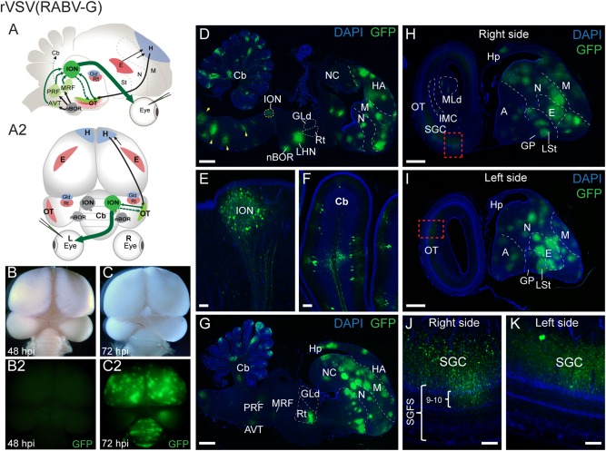 Figure 4. In ovo rVSV(RABV‐G) infection of the chicken eye shows a retrograde pattern of spread into the centrifugal visual system. (A–A2) Illustrations of the centrifugal visual system (green arrows) shown in parasagittal (A) and dorsal (A2) views. Centrifugal neurons in the isthmo‐optic nucleus (ION) target amacrine cells in the retina (A–A2, large green arrow) and have collateral axons that transiently project to the OT during development (dashed arrow). Brain regions that provide visual input to the ION include afferents from the OT, mesencephalic reticular formation (MRF), pontine reticular formation (PRF), and the area ventralis of Tsai (AVT).(B–K) GFP expression reveals a retrograde pattern of rVSV(RABV‐G) transsynaptic transmission within the brain following infection of the left retina at E14. GFP expression was not detected in the brain at 24 hpi or 48 hpi (B–B2). However, at 72 hpi widespread GFP expression was observed in the forebrain, right medial midbrain and cerebellum (C–C2). Sagittal sections through the right medial brain show rVSV(RABV‐G) transmission in regions associated with the centrifugal visual pathway and accessory optic system including the ION (D,E), nBOR (D), brainstem (D, yellow arrowheads) and cerebellum (D,F). GFP‐expressing cells also were detected in several putative retrograde targets that project to the ION (and also receive inputs from nBOR) including the MRF, PRF, and AVT (G). Distal sections through the right (H,J) and left (I,K) brain show GFP expression in the contralateral OT, including in the SGC layer and layers 9–10 of the SGFS (J,K). A = arcopallium, AVT = area ventralis of Tsai, Cb = cerebellum, E = entopallium, GLd = dorsal lateral geniculate nucleus, GP = globus pallidus, H = hyperpallium, HA = hyperpallium apicale, Hp = hippocampus, IMC = nucleus isthmi pars magnocellularis, ION = isthmo‐optic nucleus, LHN = lateral hypothalamic nucleus (visual suprachiasmatic nucleus), LSt = lateral striatum, M = mesopallium, MLd = mesencephalicus lateralis pars dorsalis, MRF = mesencephalic reticular formation, nBOR = nucleus of the basal optic root, N = nidopallium, NC = nidopallium caudale, OT = optic tectum, PRF = pontine reticular formation, Rt = nucleus rotundus, SGC = stratum griseum central (of OT), SGFS = stratum griseum et fibrosum superficiale (of OT), St = striatum. Scale bars = 1 mm in D,G,H,I; 100 µm in E,F,J,K. |