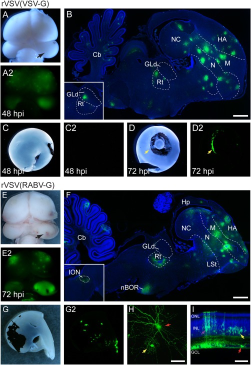 Figure 5. Infection with rVSV(RABV‐G), but not rVSV(VSV‐G), in the chicken optic tectum results in retrograde transmission from the brain to the retina. (A–D2) Injection of rVSV(VSV‐G) into the right optic tectum (OT) (arrow) resulted in an anterograde transsynaptic pattern of spread in the brain. Whole‐mount dorsal views of brightfield (A) and GFP expression (A2) in the brain at 48 hpi. Sagittal section showing GFP‐positive cells (B) in the Rt, GLd (inset from a semi‐adjacent section), and telencephalon (nidopallium, mesopallium, and hyperpallium) consistent with anterograde labeling from the OT with rVSV(VSV‐G). Brightfield (C,D) and fluorescent protein expression (C2,D2) in posterior (C) and anterior (D) views of retinae after rVSV(VSV‐G) infection of the OT. GFP expression was not detected in the retina at 48 or 72 hpi (n = 7) (C‐D2). In 2/7 embryos, GFP‐positive cells were detected in the ciliary body surrounding the lens (D,D2, yellow arrow) but were absent from the retina. (E–I) Injection of rVSV(RABV‐G) into the OT resulted in retrograde transmission and GFP expression in the retina. Dorsal views of brightfield and fluorescent (GFP) images (E–E2) of the brain at 72 hpi. Sagittal section showing GFP expression in the brain (F) including in the ION (inset), nBOR, cerebellum, Rt, and telencephalon. At 72 hpi, OT injections with rVSV(RABV‐G) resulted in in clusters of GFP‐positive cells throughout the retina (n = 3) (G–G2). Confocal z‐stack projection showing GFP expression in a RGC (H, red arrow) and an adjacent amacrine cell (H, yellow arrow) in a flat‐mount preparation of the left retina. Transverse section through a retina shows GFP expression in several retinal cell types including RGCs (I, red arrow), Müller glia (I, purple arrow), and amacrine cells in the lower half of the INL (I, yellow arrow). GFP‐expressing cells in the INL were only found in locations proximal to GFP‐positive RGCs. Cb = cerebellum, GCL=ganglion cell layer (of retina), GLd = dorsal lateral geniculate nucleus, HA = hyperpallium apicale, Hp = hippocampus, INL = inner nuclear layer (of retina), LSt = lateral striatum, M = mesopallium, nBOR = nucleus of the basal optic root, N = nidopallium, NC = nidopallium caudale, ONL = outer nuclear layer (of retina), Rt = nucleus rotundus. Scale bars = 1 mm in B,F; 50 μm in H,I. |