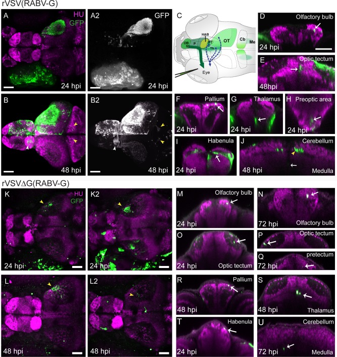 Figure 7. Labeling of centrifugal circuits in zebrafish with rVSV(RABV‐G). (A,B) Dorsal view of confocal maximal projections showing rVSV(RABV‐G) labeling (green, GFP) and HU (magenta, pan‐neuronal marker) at 24 hpi (A) and 48 hpi (B). GFP channel from (A,B), with signal enhanced to show cells in the brain, is shown in (A2,B2). Images in (B–B2) were captured after dissection of the brain from surrounding tissues. GFP‐labeled axonal projections from the contralateral to the ipsilateral habenula (white arrowhead) and projections from the OT to the cerebellum (yellow arrowheads) are indicated in (B–B2). (C) Illustration showing injection of rVSV(RABV‐G) into the eye of 3 dpf larval zebrafish. Centrifugal axons in the terminal nerve (tn) originate from the contralateral olfactory bulb (OB) and ventral pallium (P), and project to target cells in the retina (dark green arrow). The locations of rVSV(RABV‐G)‐infected cells after unilateral eye injection is indicated by green shaded areas. Projections from other centrifugal neurons previously reported among teleost fish are indicated by dashed arrows from the thalamus (Th), OT, and pretectum (PT). (D–J) Transverse optical sections from 24 hpi or 48 hpi are shown. At 24 hpi, labeling is restricted to the RGC axons in the neuropil of OT, and cell bodies in the OB (D), OT (E, 48 hpi shown), pallium (F), thalamus (G), preoptic area (H), habenula (I), medulla (J, 48 hpi shown), and pretectum (not shown). At 48 hpi, additional labeling was seen, including GFP‐positive efferent axons (yellow arrowhead) projecting into the contralateral and ipsilateral cerebellum (J). (K–L2) Confocal maximal projections of GFP expression and HU after injection of 1 × 108 ffu/mL (K,L), or 1 × 109 ffu/mL (K2,L2) rVSVΔG(RABV‐G), at 24–48 hpi. Yellow arrowheads in (K–L2) indicate RGC axons in the neuropil of the OT. In zebrafish injected with the higher dose of rVSVΔG(RABV‐G), labeling revealed primary infection in centrifugal neurons. (M–U) Representative transverse optical sections from 24–72 hpi show the results of centrifugal labeling, as sparse GFP‐expressing cells in the OB (M,N), OT (O,P), pretectum (Q), pallium (R), thalamus (S), habenula (T), and medulla (U). GFP‐labeled cells were not detected in the preoptic area (not shown) and labeled axons were not present in the cerebellum (U) following infections with rVSVΔG (RABV‐G). CB = cerebellum, HAB = habenula, Me = medulla, OB = olfactory bulb, OT = optic tectum, P= pallium, PT = pretectum, PO = preoptic area, tn = terminal nerve, Scale bars: = 50 μm. |