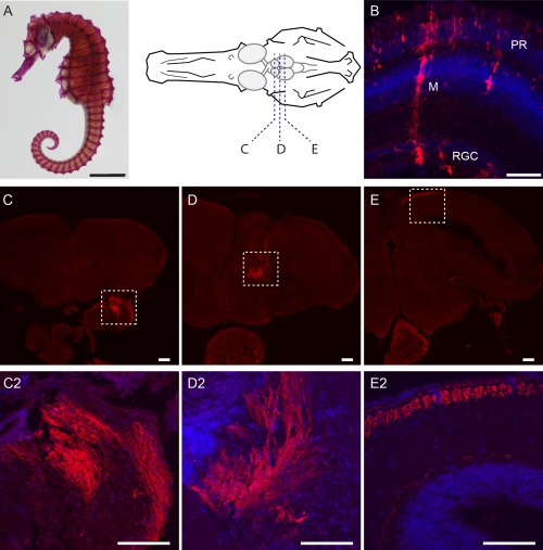 Figure 9. rVSV(VSV‐G) can infect seahorse retinae and allows mapping of retinorecipient areas in the brain. (A) Skeletal preparation of a seahorse (Hippocampus erectus) and schematic drawing of a seahorse skull with the brain. Dashed lines indicate approximate brain regions for sections in C–E. (B) Injection of rVSV(VSV‐G) into the retina resulted in infection of various retinal cell types (3 dpi). (C–E) Brain sections depicting labeled RGC arbors throughout the seahorse brain, following injection of rVSV(VSV‐G) into the retina. C2, D2, E2 are higher‐magnification images of RGC axons in C–E. A small number of infected cell bodies were detected in the brain. Red = GFP, blue = DAPI. PR = photoreceptors, M = Müller glia, RGC = retinal ganglion cells. Scale bars = 50 μm. |