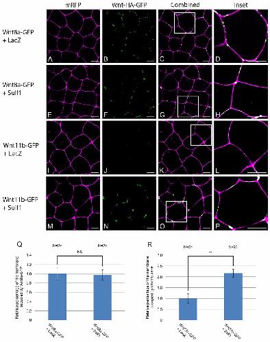 Fig. 6. Sulf1 enhances the accumulation of Wnt11bâGFP on the cell membrane. (AâP) Xenopus laevis embryos were microinjected bilaterally with mRNA encoding mRFP (500 pg) into the animal hemisphere at the two-cell stage. In addition, embryos were injected with mRNA encoding LacZ (4 ng), Sulf1 (4 ng), Wnt8aâ GFP (500 pg), Wnt11bâGFP (1 ng) or a mixture of the four. (AâD) Control animal explants overexpressing LacZ and Wnt8aâ GFP. (EâH) Animal explants overexpressing Sulf1 and Wnt8aâGFP. (IâL) Control animal explants overexpressing LacZ and Wnt11bâGFP. (MâP) Animal explants overexpressing Sulf1 and Wnt11bâGFP. The white boxes in C, G, K and O mark the areas that are enlarged in D, H, L and P, respectively. mRFP is shown in magenta, Wnt8aâ or Wnt11bâGFP is shown in green. Scale bars: 20 mm. (Q,R) Graphs quantifying the relative levels of (Q) Wnt8aâGFP and (R) Wnt11bâGFP on the cell membrane. Data was quantified using a programme written in Matlab, results are mean6s.e.m. **P,0.01; NS, not significant (Mannâ Whitney U test). N, number of embryos. |
