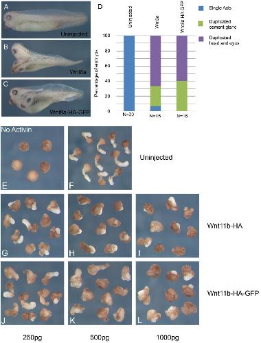 Figure 3 Wnt8a-GFP and Wnt11b-GFP are biologically active. mRNA encoding Wnt8a (10pg) or Wnt8a-HA-GFP (10pg) was injected into one ventral blastomere of an embryo at the four cell stage. Embryos were cultured until NF stage 38 and then examined for phenotype. [A] Lateral view of an uninjected embryo. [B]. An example of an embryo injected with Wnt8a. [C]. An example of an embryo injected with Wnt8a-HA-GFP.[ D]. Graph depicting the quantification of the frequency of axis duplication in embryos over-expressing Wnt8a and Wnt8-HAGFP. Wnt8a-HA-GFP showed a similar level of activity to Wnt8a in axis duplication assays. mRNA encoding Wnt11-HA or Wnt11-HA-GFP was injected bilaterally into the animal hemisphere of embryos at the two cell stage. Embryos were cultured until NF stage 8 and then animal cap explants were explanted and cultured in either the presence or absence of activin until NF stage 19. [A-B] Uninjected animal caps cultured in either the absence [E] or presence [F] of activin. [G-I] Animal caps treated with activin and injected with increasing amounts of Wnt11b-HA. [H-L] Animal caps treated with activin and injected with increasing amounts of Wnt11b-HA-GFP. Over-expression of increasing amounts of Wnt11-HA or Wnt11-HA-GFP inhibited activin induced convergent extension of animal caps to a similar extent. |