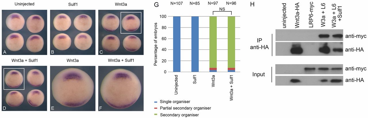 Fig. 3. Sulf1 does not inhibit the ability of Wnt3a to induce axis duplication. (AâF) Xenopus laevis embryos were microinjected with mRNA encoding Wnt3a (5 pg) and/or Sulf1 (1 ng) into a single ventral blastomere at the four-cell stage. In situ hybridisation for the gene chordin was performed at NF stage 10.5. (A) Uninjected control embryos; (BâD) embryos injected with (B) Sulf1, (C) Wnt3a or (D) Sulf1 and Wnt3a. The areas indicated in the white boxes in C and D are enlarged in E and F, respectively. (G) The data shown in AâF is quantified in G. NS, not significant (Chi squared test), N, number of embryos. (H) Immunoprecipitation (IP) of epitope-tagged proteins expressed in animal caps injected with the mRNAs indicated. The top panel shows protein immunoprecipitated with an antibody against HA (Wnt3a is tagged with HA) and immunoblotted with an antibodies against Myc (LRP6 is tagged with Myc). The bottom two panels are protein lysates prior to immunoprecipitation. |