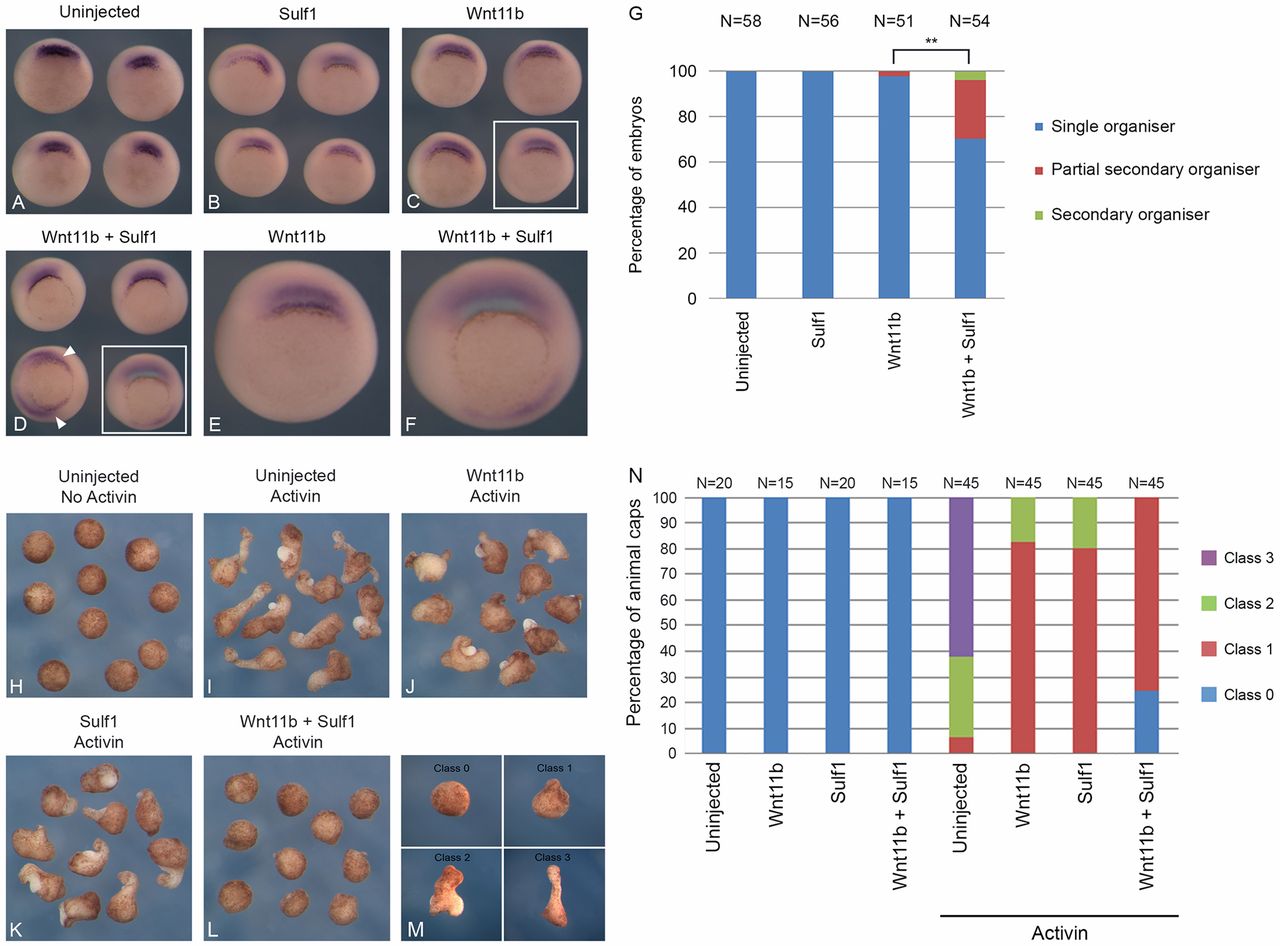 Fig. 4. Sulf1 enhances the ability of Wnt11b to activate both canonical and non-canonical Wnt signalling. (AâF) Xenopus laevis embryos were microinjected with mRNA encoding Wnt11b (600 pg) and/or Sulf1 (1 ng) into a single ventral blastomere at the four-cell stage. In situ hybridisation for the gene chordin was performed at NF stage 10.5. (A) Uninjected control embryos; (BâD) embryos injected with (B) Sulf1, (C) Wnt3a or (D) Sulf1 and Wnt11b. The areas indicated in the white boxes in in C and D are enlarged in E and F, respectively. (G) The data in AâF is quantified in G. **P,0.01 (Chi squared test). (HâL) Embryos were microinjected bilaterally in the animal hemisphere with mRNA encoding Wnt11b (50 pg) and Sulf1 (500 pg). Embryos were cultured until NF stage 8, animal explants were taken and cultured until NF stage 10.5 in either the presence or absence of activin. (H,I) Control animal explants culture in either the absence (H) or presence (I) of activin. (JâL) Animal explants injected with (J) Wnt11b, (K) Sulf1 or (L) Wnt11b and Sulf1. (M) The classification system used to score animal cap explants shown in N. (N) The data shown in HâL is quantified in N. N, number of embryos. |