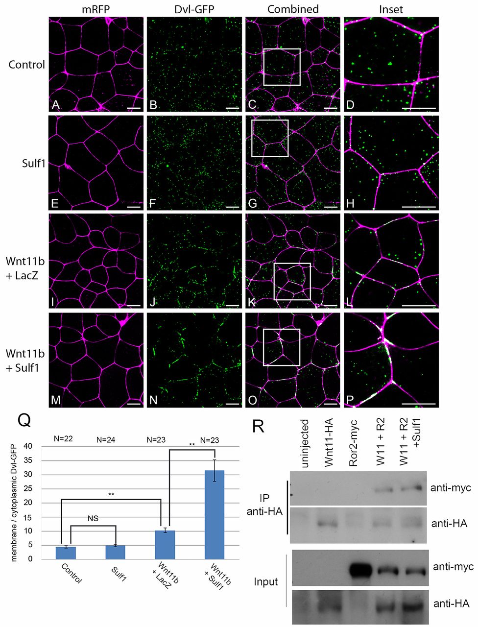 Fig. 5. Sulf1 enhances Wnt11b induced DvlâGFP translocation to the cell membrane. (AâP) Xenopus laevis embryos were microinjected bilaterally with mRNA encoding mRFP (500 pg) and DvlâGFP (500 pg) into the animal hemisphere at the two-cell stage. In addition embryos were injected with mRNA encoding Sulf1 (4 ng), LacZ (4 ng), Wnt11b (400 pg) or a mixture of the three. (AâD) Control animal explants overexpressing mRFP and DvlâGFP. Animal explants injected with (EâH) Sulf1, (IâL) Wnt11b and LacZ or (MâP) Sulf1 and Wnt11b. The white boxes in C, G, K and O mark the areas that are enlarged in D, H, L and P, respectively. mRFP is shown in magenta, DvlâGFP is shown in green. Scale bars: 20 mm. (Q) The data shown in AâP is quantified in Q. Quantification was done using a program written in MatLab, results are mean6s.e.m. **P,0.01; NS, not significant (MannâWhitney U test). N, number of embryos. (R) Immunoprecipitation (IP) of epitope-tagged proteins expressed in animal caps injected with the mRNAs indicated. The top panel shows protein immunoprecipitated with an antibody against HA (Wnt11b is tagged with HA) and immunoblotted with an antibodies against Myc (Ror2 is tagged with Myc). The bottom two panels are protein lysates prior to immunoprecipitation. |