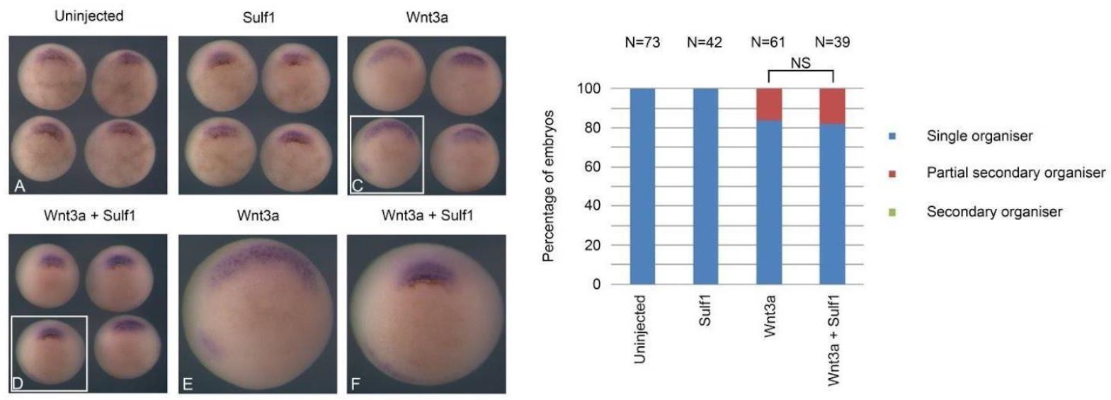 Figure 1 [A-F] Xenopus laevis embryos were microinjected with mRNA encoding Wnt3a (0.1pg) and Sulf1 (1ng) into a single ventral blastomere at the four cell stage. In situ hybridisation for the gene chordin was performed at NF stage 10.5. [A] Uninjected control embryos. [B-D] Embryos injected with [B] Sulf1, [C] Wnt3a or [D] Sulf1 and Wnt3a. The white boxes in [C] and [D] were used to create panels [E] and [F] respectively. [G] The data shown in [A-F] is quantified in [G], Chi squared test (NS=not significant), N=number of embryos. |