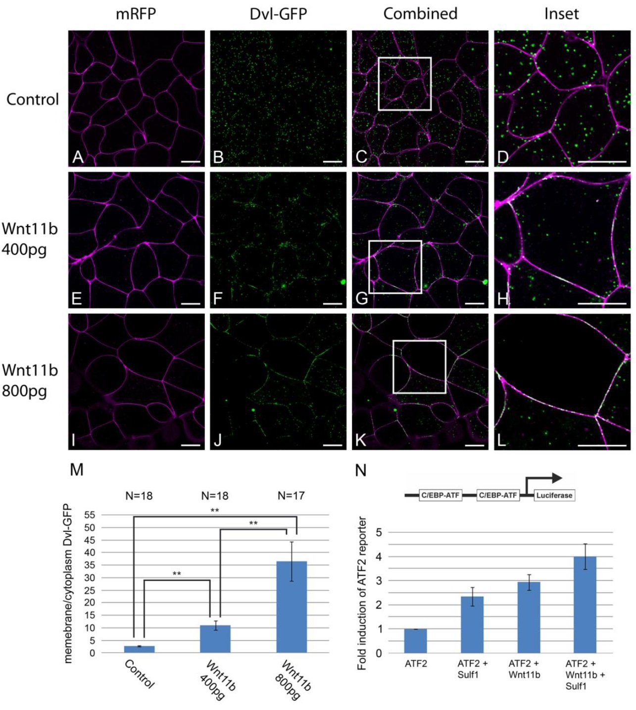Figure 2 [A-L] Xenopus laevis embryos were microinjected bilaterally with mRNA encoding mRFP (500pg) and Dvl-GFP (500pg) into the animal hemisphere at the two cell stage. In addition embryos were injected with increasing amounts of Wnt11b mRNA. [A-D] Control animal explants over expressing mRFP and Dvl-GFP. Animal explants injected with [E-H] Wnt11b (400pg) or [I-L] Wnt11b (800pg) mRNA. The white boxes in [C], [G] and [K] mark the areas used to create panels [D], [H] and [L] respectively. [M] The data shown in [A-L] is quantified in [M]. Quantification was done using a program written in MatLab, Mann-Whitney U (**P<0.01), error bars represent s.e.m, N=number of embryos. mRFP (magenta), Dvl-GFP (green), scale bars represent 20um. [N] A diagram of the ATF2 reporter used for this assay is shown above a graph depicting the results obtained when 100pg of ATF reporter plasmid DNA and 1pg of Renilla was injected into the marginal zone of all four cells of four cell stage Xenopus laevis embryos. In addition embryos were injected with mRNA encoding Sulf1 (4ng) or Wnt11b (200pg) with a control mRNA or with Wnt11b (200pg) together with Sulf1. Embryos were lysed and analysed in a luminometer at stage 10 to assay luciferase activity. The graph illustrates the effects of Sulf1 and Wnt11b on the activation of the ATF reporter. |