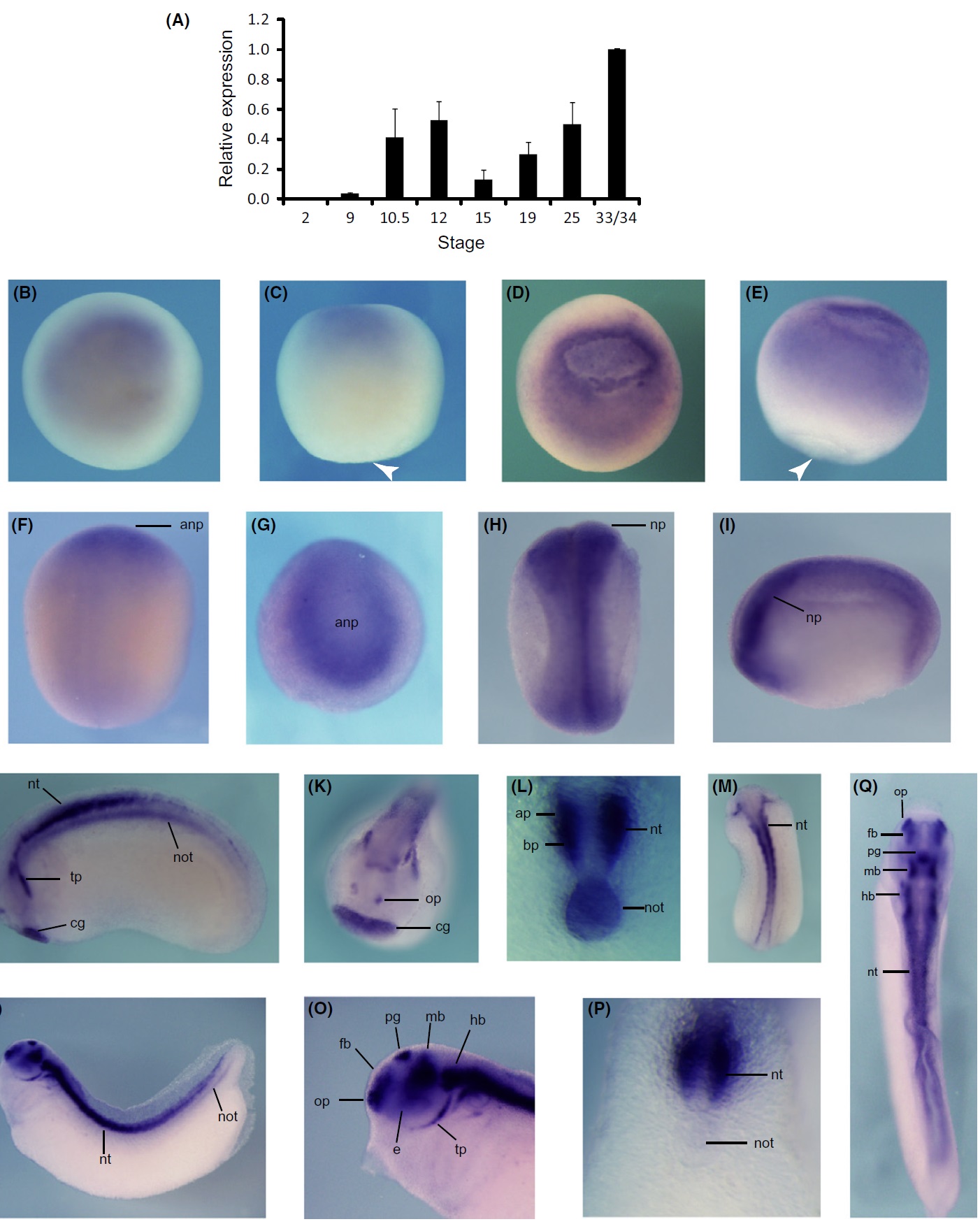 34 embryo shown in N. (P) A transverse trunk section of the middle part of a stage 33/34 embryo. anp, anterior neural plate; np,