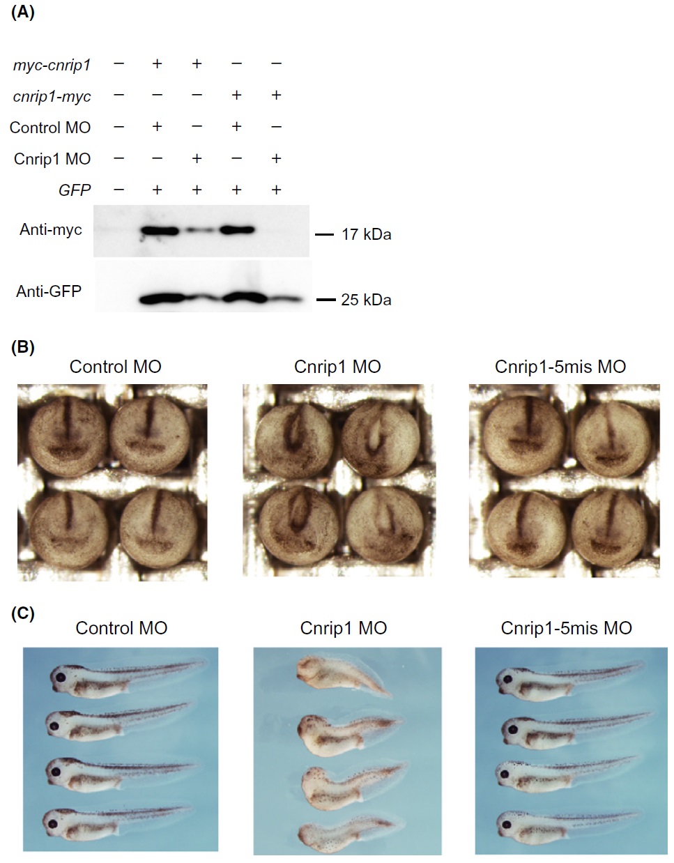 embryos were collected at stage 10.5 and extracted for immunoblotting analysis. (B, C) Control MO, cnrip1 MO or cnrip1-5mis
