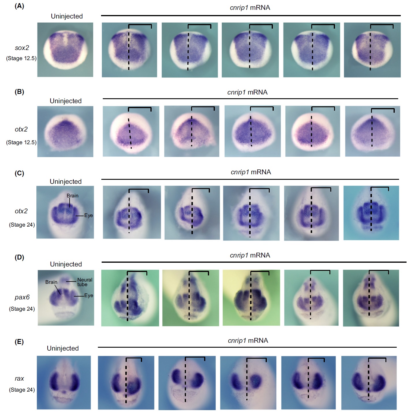 Figure 4 Effects of cnrip1 over-expression on spatial expression patterns of sox2, otx2, pax6 and rax. Whole-mount in situ hybridization