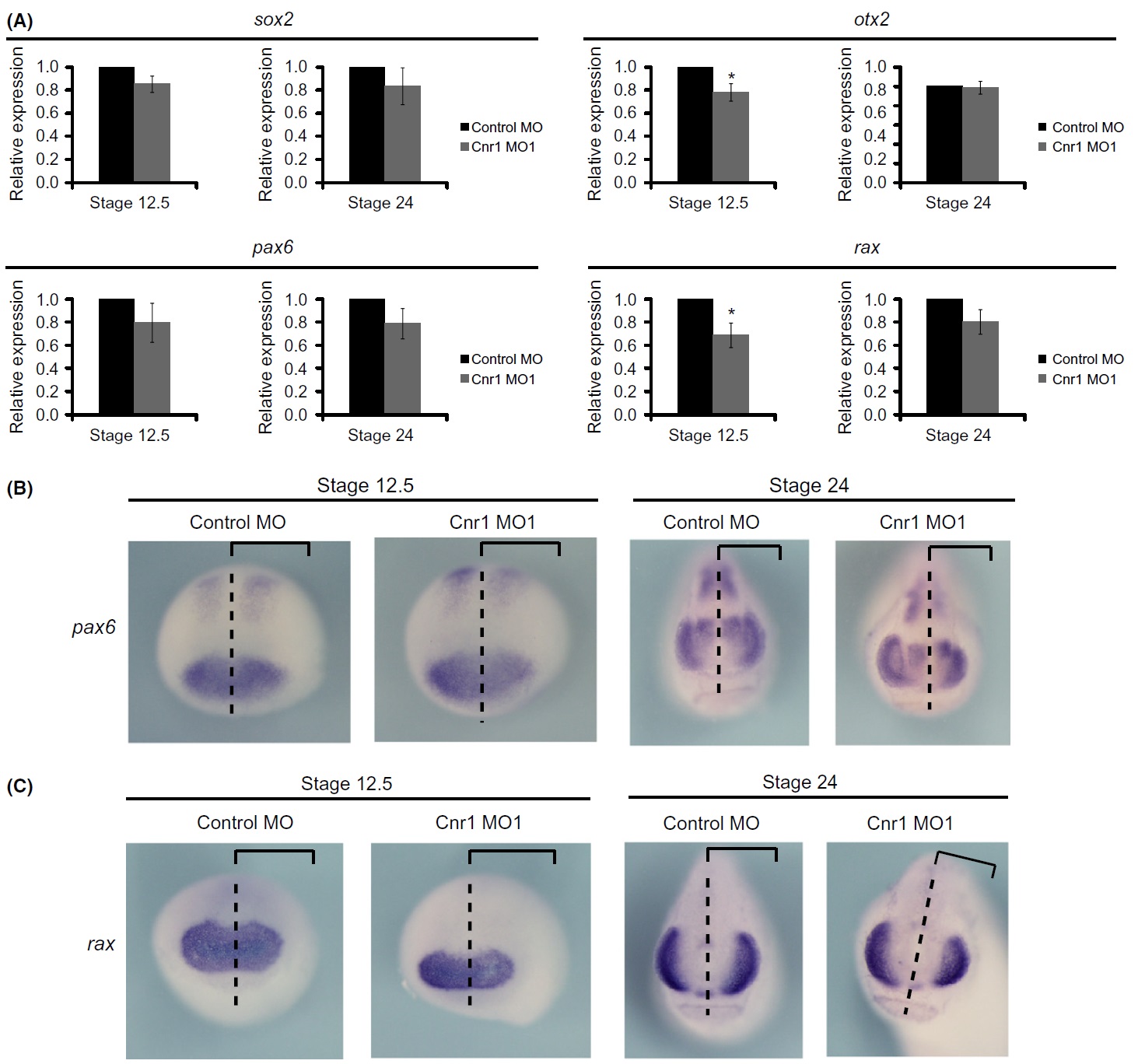 Figure 8 Effects of cnr1 knockdown on expression of sox2, otx2, pax6 and rax. (A) qRT-PCR analysis for marker gene expression