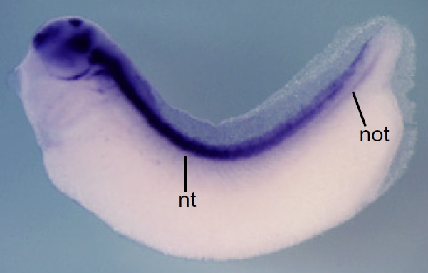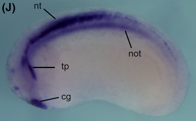 neural plate; nt, neural tube; not, notochord; cg, cement gland; tp, trigeminal placode; op, olfactory placode; fb, forebrain; pg,