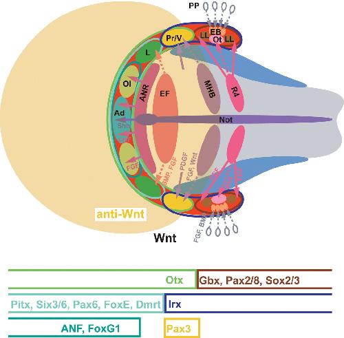 Fig. 2. Anteroposterior ectodermal patterning and origin of individual placodes from the panplacodal primordium. The panplacodal primordium is patterned along the anteroposterior axis by posteriorly restricted Wnt signals and by various signalling centres in the neural plate and mesoderm. These induce transcription factors within the panplacodal primordium (red), which specify precursor regions for multiplacodal areas (coloured outlines) and individual placodes (coloured ovals). A few examples of transcription factors are given below. Ad: adenohypophyseal placode; ANR: anterior neural ridge; EB: epibranchial placodes; EF: eye field; L: lens placode; LL: lateral line placodes; MHB: midbrainâhindbrain boundary; Not: notochord; Ol: olfactory placode; Ot: otic placode; PP: pharyngeal pouches, Pr/V: profundal/trigeminal placode; R4: rhombomere 4 (modified from Schlosser, 2010).