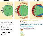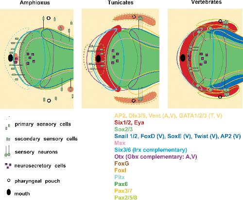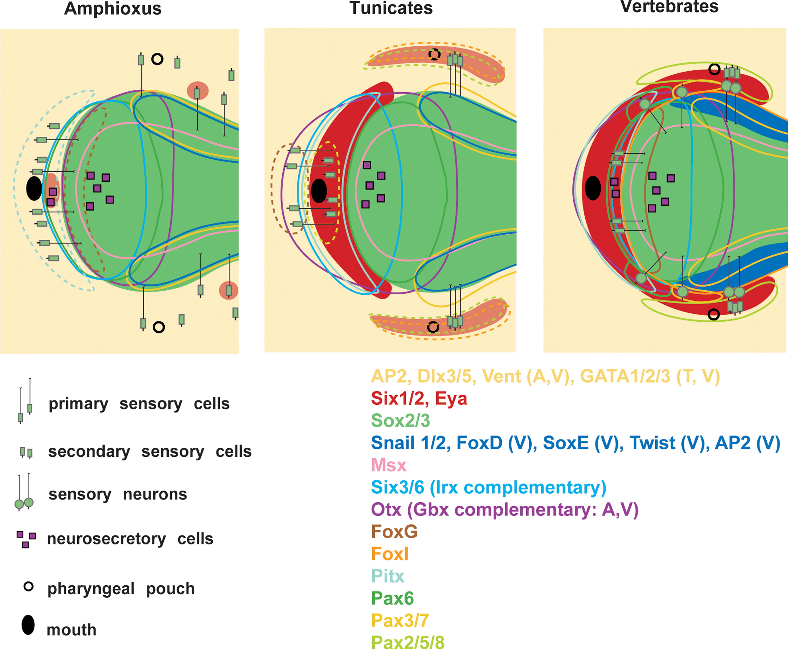 Fig. 3. Schematic overview of transcription factor expression domains and origin of differentiated cell types around the neural plate in chordate embryos. The neural plate is indicated in green and epidermis in yellow. Domains of Six1/2 and Eya expression are shown in red. Pale red domains in amphioxus (Hatschek׳s pit and sensory cells) and tunicates (atrial siphon primordia) indicate expression domains only established at later developmental stages. Coloured outlines enclose transcription factor expression domains except for Msx1 in all taxa and FoxI in vertebrates, which are expressed peripheral to the lines shown. Hatched lines indicate transcription factor expression domains that are only established at later developmental stages. The Snail1/2 expression domains in amphioxus and tunicates are shown by a blue outline, whereas the neural crest domain in vertebrates, which coexpresses Snail1/2 with an array of other transcription factors is shown in solid blue. Expression domains of Irx and Gbx genes are not shown, but are posteriorly abutting the domains of Six3/6 and Otx expression, respectively. Some expression domains are found only in a subset of taxa as indicated (A: amphioxus; T: tunicates; V: vertebrates). See text for details.