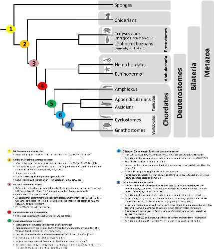 Key steps in placode evolution. Evolutionary changes of ectodermal patterning mechanisms and origin of new cell types are mapped onto the phylogenetic tree of metazoans. Important nodes are numbered and the key depicts which characters can be traced to each node. Character origination events whose placement on the tree is controversial are indicated by a question mark. AP: anteroposterior; DV: dorsoventral; TF: transcription factor.