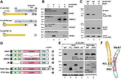 Fig. 3. PN1 binds to HtrA1. (A) Overview of FLAG-tagged protein constructs of wild-type PN1, point mutant PN1pm and C-terminal deletion mutant PN1δC. Arrowhead indicates the signal peptide cleavage site and numbers indicate the amino acid position of the reactive center loop (RCL). Plus/minus signs indicate binding to HtrA1 protein. (B) HtrA1 co-immunoprecipitates with FLAG-PN1, and FLAG-PN1 in turn co-immunoprecipitates with HtrA1 in mRNA-injected embryos at stage 17. (C) Overexpressed HtrA1 immunoprecipitates FLAG-PN1pm less efficiently than FLAG-PN1 and fails to immunoprecipitate FLAG-PN1δC in embryos at stage 10.5. (D) Overview of wild-type and mutant HtrA1 protein constructs. Plus/minus signs indicate binding to PN1 protein. SP, signal peptide; IB, IGF-binding domain; K, kazal-type serine protease inhibitor domain; Trypsin, trypsin-like serine protease domain; PDZ, PSD95/DLG1/ZO1 domain. The region recognized by HtrA1 antibody is indicated. (E) All indicated HtrA1 constructs, except HtrA1δTry, immunoprecipitate FLAG-PN1 at similar levels in embryos at stage 11. (F) Model of PN1-HtrA1 interaction. The trypsin domain of HtrA1 binds to the RCL-containing C-terminus of PN1. (B,C,E) mRNA amounts were: HtrA1-derived, 100â pg; PN1-derived, 300â pg. |
