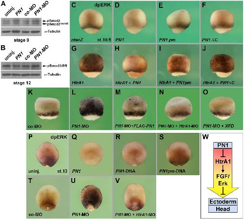 Fig. 6. PN1 specifically blocks FGF/Erk signaling via inhibition of HtrA1. (A,B) Immunoblot analysis of Xenopus embryos. Injection of PN1 mRNA, co-MO or PN1-MO has no effect on phosphorylated Smad2 (pSmad2/pSmad2δexon2) at stage 9 nor on pSmad1/5/8 at stage 12. Xenopus Smad proteins run between 55 and 60â kDa (Faure et al., 2000). (C-F) Early gastrula embryos in lateral view after immunostaining for activated Erk (dpERK). A single marginal injection of PN1, but not PN1pm or PN1δC mRNA, inhibits endogenous Erk phosphorylation in the marginal zone. (G-J) A single animal injection of HtrA1 mRNA induces ectopic dpERK signals in the animal cap. PN1 blocks HtrA1-induced Erk activation. PN1pm has weak and PN1δC has no rescuing effect. (K-O) PN1-MO, but not co-MO, induces ectopic dpERK in the animal hemisphere. Co-injection of non-targeted FLAG-PN1 mRNA, 20â ng HtrA1-MO and XFD mRNA restores normal Erk activation in PN1 morphant embryos. (P-V) Dorsal view of late gastrula embryos. Injections of PN1 mRNA and pCS2-PN1 (PN1-DNA), but not pCS2-PN1pm (PN1pm-DNA), suppress dpERK signals in the posterior mesoderm (Q-S). PN1-MO induces anteriorward expansion of active Erk (U), which is reverted by co-injection of HtrA1-MO (V). (W) Deduced model of PN1 action. PN1 stimulates ectoderm and head development by inhibition of HtrA1 and FGF/Erk signaling. Injected mRNA amounts were: PN1-derived, 4â ng (800â pg in C-F,K-O; 300â pg in G-J); HtrA1, 100â pg; XFD, 80â pg. Indicated phenotypes were shown by: C, 23/25; D, 37/49; E, 17/22; F, 25/31; G, 86/93; H, 79/90; I, 40/45; J, 57/74; K, 92/96; L, 122/139; M, 25/35; N, 25/28; O, 17/19; P, 73/73; Q, 7/7; R, 23/33; S, 20/21; T, 43/46; U, 9/12; V, 39/47. |