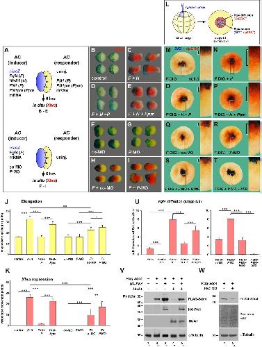 Fig. 5. PN1 functions in an HtrA1-, FGF- and Wnt-dependent manner. (A-Dâ²) Lateral view of early gastrula embryos. PN1-MO, HtrA1 mRNA and Fgf4 mRNA, but not co-MO, induce ectopic Xbra expression (A-D) and a reduction of Foxi1e expression (Aâ²-Dâ²) in the animal hemisphere. (E-Fâ²) In PN1 morphant embryos, 20â ng HtrA1-MO and XFD mRNA restore normal expression of Xbra and Foxi1e. (G-I) Random-MO, PN1-5mm-MO, and a combination of PN1-MO and non-targeted FLAG-PN1 mRNA do not affect Xbra expression. (J-T) Dorsal view of neurulae. A single injection of PN1-MO shifts the border between Otx2 and Papc (brackets in K) and expands Xcad3 expression (arrowheads in T) anteriorward. Co-MO and PN1-5mm-MO have no effect on Otx2 and Papc (J,R), and random-MO has no effect on Xcad3 expression (S). HtrA1 mRNA, Fgf4 mRNA and Wnt3a-DNA reduce Otx2, but only HtrA1 and Fgf4 expand Papc expression (L,M,P). Co-injections of 5â ng HtrA1-MO, XFD and Dkk1 mRNA revert the effect of PN1-MO and cause slight expansion of Otx2 and posteriorward retraction of Papc signals (N,O,Q). (U-BB) PN1-MO reduces head structures (arrowhead) and expands the proctodeum (bracket in V), whereas co-MO, random-MO and PN1-5mm-MO have no effect in tailbud embryos (U,AA,BB). 20â ng HtrA1-MO, XFD, Dkk1 and FLAG-PN1 rescue posteriorization in PN1 morphants (W-Z). Injected mRNA amounts per embryo were: HtrA1, 200â pg (50â pg in L); Fgf4, 2â pg (0.5â pg in M); XFD, 80â pg (20â pg in O); FLAG-PN1, 800â pg; Dkk1, 24â pg (8â pg in Q). Indicated phenotypes were shown by: A, 136/144; Aâ², 50/59; B, 154/186; Bâ², 50/69; C, 21/21; Câ², 47/57; D, 79/79; Dâ², 93/97; E, 66/90; Eâ², 52/56; F, 72/83; Fâ², 45/51; G, 24/30; H, 44/46; I, 14/24; J, 12/13; K, 14/14; L, 60/60; M, 45/49; N, 17/17; O, 9/9; P, 34/36; Q, 55/55; R, 31/32; S, 8/8; T, 28/30; U, 75/77; V, 97/95; W, 48/59; X, 23/24; Y, 67/65; Z, 22/23; AA, 7/10; BB, 10/15. |