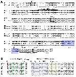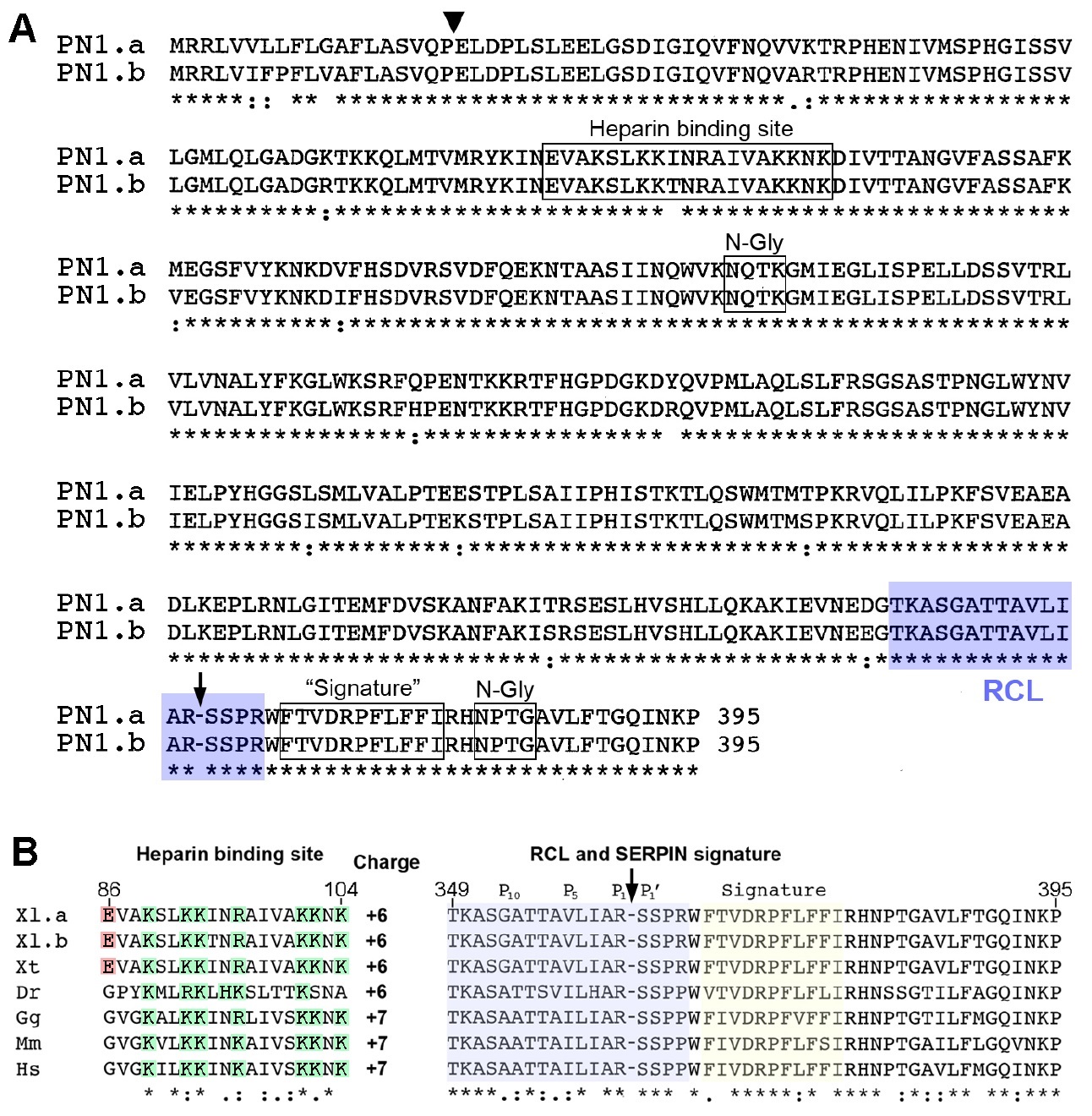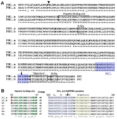 Figure S1. PN1 protein sequences The alignment was performed using Clustal Omega multiple sequence alignment (EMBL-EBI) (Sievers et al., 2011). Identical amino acids are indicated with asterisks, similar residues with double points, and semi-conserved with single points. The RCL is indicated with a blue box and the SERPIN signature with a yellow box as determined by ScanProsite (http://prosite.expasy.org/scanprosite/) (Sigrist et al., 2010). The P1-P1’ reactive site scissile bond in the RCL is indicated with a downward arrow (McGrogan et al., 1988). (A) The signal peptide cleavage sites of Xenopus laevis PN1.a and PN1.b. were determined using SignalP 4.0 (Petersen et al., 2011) and are marked with an arrowhead. Boxes show the Heparin binding site (Stone et al., 1994) and the two N-Gly sites (predicted using the program NetNGlyc 1.0 Server (http://www.cbs.dtu.dk/services/NetNGlyc/). The numbers at the end of the sequences indicate the total length of the proteins. NCBI GenBank accession numbers are: PN1.a, DQ324047; PN1.b, BC077742. N-Gly, N-linked glycosylation; RCL, reactive center loop; SERPIN, serine protease inhibitor. (B) Conserved functional domains of vertebrate PN1 proteins. Positive and negative amino acids in the heparin binding side are indicated in green and red, respectively. Px indicates amino acid positions in the RCL. Dr, zebrafish; Gg, chicken, Hs, human; Mm, mouse; Xl, African claw frog; Xt, Western clawed frog. |