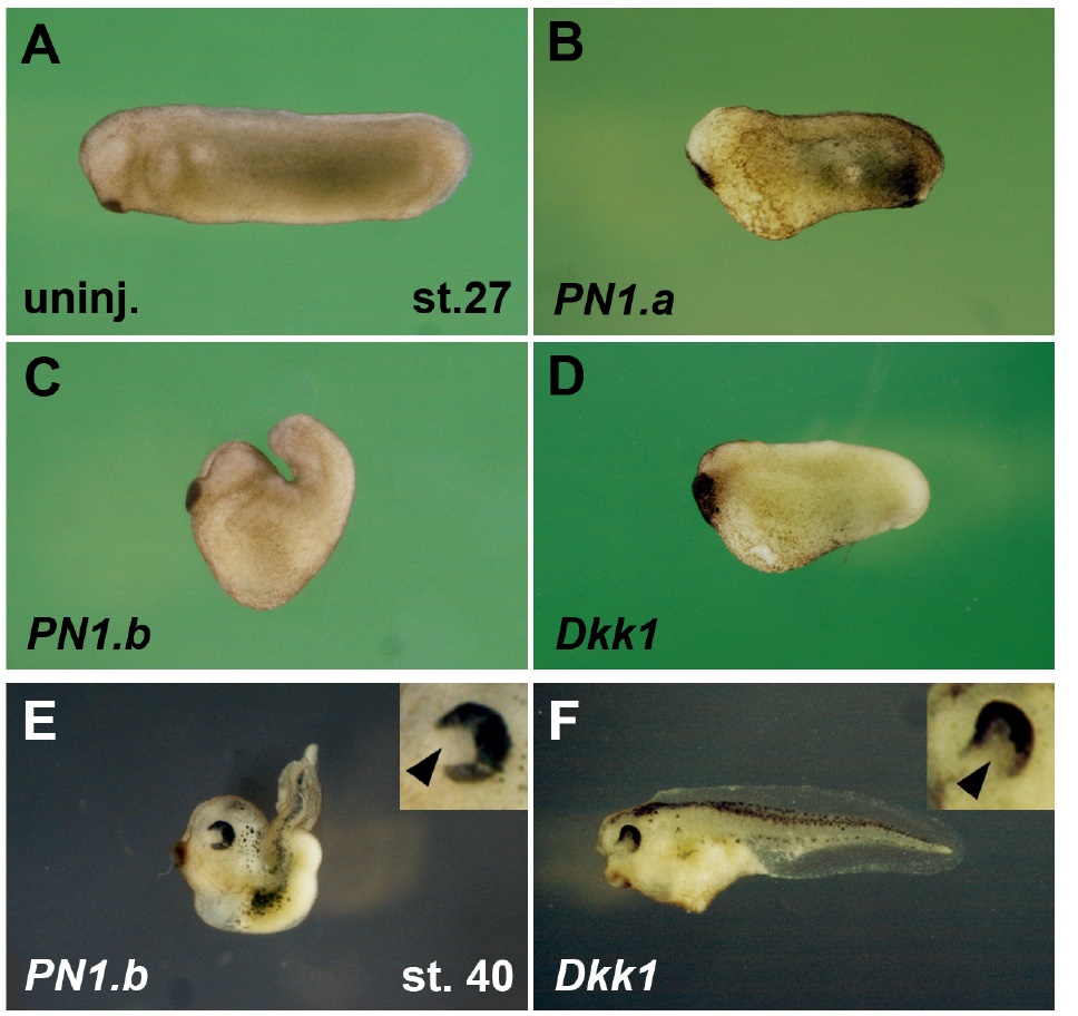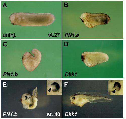Figure S3. Overexpression of PN1 and Dkk1 promote anterior development (A) Uninjected embryo at tailbud stage. (B-D) PN1.a, PN1.b, and Dkk1 mRNA induce enlarged head and shortened trunk/tail structures. (E,F) PN1.b and Dkk1 mRNA widen eye structures in tadpole embryos. Insets show magnification of eye. Note the expansion of the optic fissure (arrowhead) that is characteristic of coloboma. Embryos were animally injected at the 4-cell stage with mRNAs: PN1.a, 4 ng; PN1.b, 16 ng; Dkk1, 32 pg. Indicated phenotypes were observed in B, 40/54; C, 23/23; D, 34/34; E, 26/31; F, 46/53. |