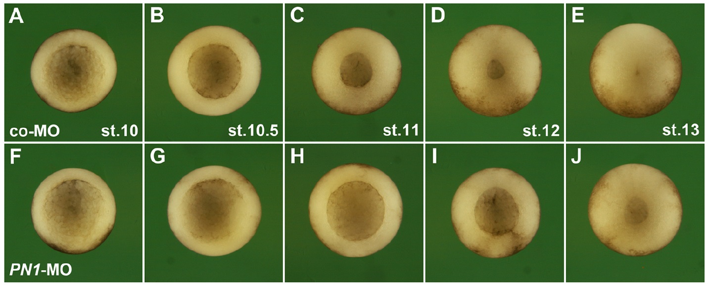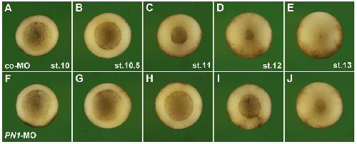 Figure S5. Knockdown of PN1 delays gastrulation Embryos were animally injected with 60 ng MOs at the 4-cell stage. Embryos are shown in vegetal view, dorsal to the top, from the onset (left) to the end of gastrulation (right). Vertically aligned embryos are time-matched. (A-E) Control-MO-injected embryos undergo normal gastrulation, which results in full closure of the circular blastopore. (F-J) PN1-MO does not affect the onset of gastrulation at stage 10 (F), but causes a delay in blastopore closure at subsequent stages. Pictures are representative of a minimum of 20 analysed embryos. |
