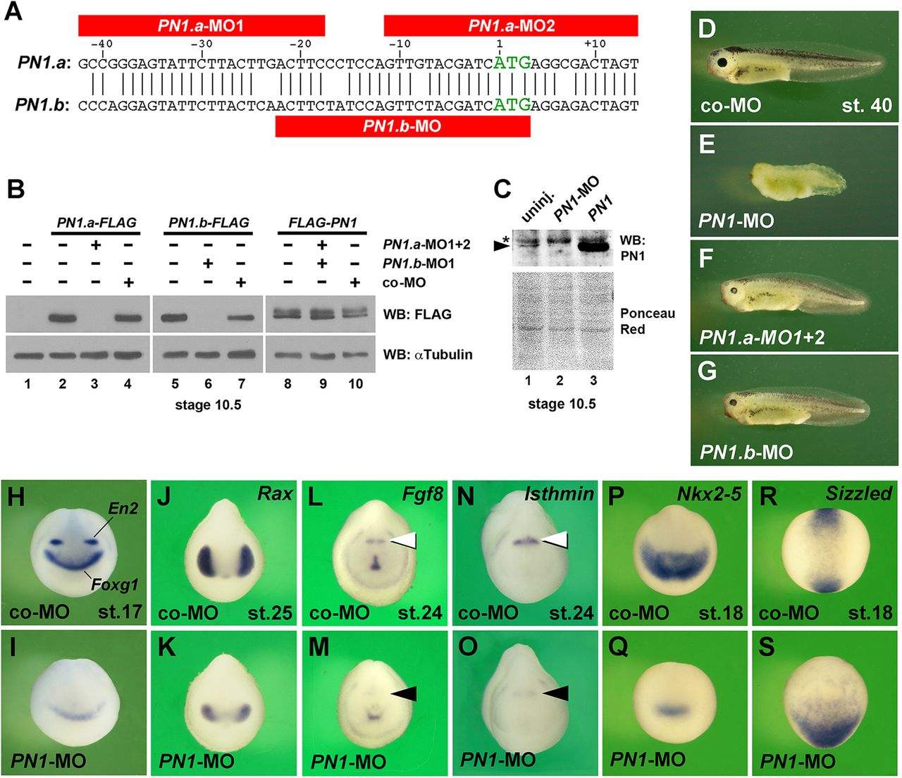 Fig. 4. Redundant functions of PN1.a and PN1.b in head and primary axis development. (A) Three antisense morpholino oligonucleotides (MOs) target the translation initiation sites of the PN1.a and PN1.b homeologs. (B) Immunoblot analysis of Xenopus gastrula embryos. PN1.a-MO1+2 and PN1.b-MO, but not standard control MO (co-MO), inhibit translation of injected PN1.a-FLAG and PN1.b-FLAG mRNAs (each 800â pg), respectively. Protein synthesis from non-targeted FLAG-PN1 mRNA (800â pg) is not affected. WB, western blot. αTubulin provides a loading control. (C) PN1-MO blocks endogenous PN1 protein expression (arrowhead). The asterisk marks a non-specific band. Ponceau Red staining shows equal protein loading. (D) Co-MO-injected tadpole. (E-G) Microinjection of either PN1.a-MO1+2 or PN1.b-MO causes microcephaly. A combination of all three MOs (designated PN1-MO) results in severe reduction of head and shortening of tail structures. (H-Q) PN1-MO induces depletion of En2 and reduction of Foxg1, Rax and Nkx2-5 expression. Fgf8 and Ism expression is severely reduced at the midbrain-hindbrain boundary (arrowheads). (R,S) Reduction of anterior and expansion of posterior Sizzled expression in PN1-depleted embryo. Indicated phenotypes were shown by: D, 29/31; E, 125/161; F, 102/134; G, 34/38; H, 71/77; I, 26/28; J, 45/45; K, 60/67; L, 40/45; M, 61/66; N, 16/18; O, 25/29; P, 40/40; Q, 25/25; R, 53/54; S, 33/39. |