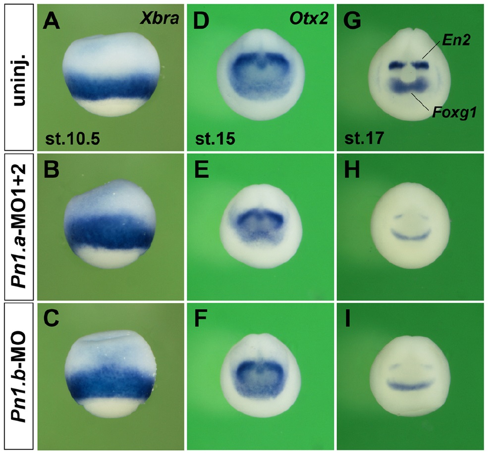 Figure S6. Downregulation of each PN1 homeolog mildly stimulates mesoderm formation and reduces anterior development Xenopus embryos were injected with a total of 60 ng MOs into the animal pole at the 4-cell stage. PN1.a-MO1+2 is an equal mixture of PN1.a-MO1 and PN1.a-MO2. (A-C) Lateral view of early gastrula embryos after whole-mount in situ hybridization. Embryos injected with PN1.a-MO1+2 (B) or PN1.b-MO (C) exhibit a slight expansion of the mesodermal marker Xbra towards the animal pole. (D-F) Anterior view of neurula embryos. Note the decreased expression domain of the anterior marker Otx2 in embryos depleted of PN1.a (E) or PN1.b proteins (F). (G-I) Anterior view of late neurulae. Embryos deficient for PN1.a (H) or PN1.b (I) show reduced expression of the telencephalic marker Foxg1 and the posterior midbrain marker En2. Indicated phenotypes were observed in B, 19/19; C, 14/17; E, 11/11; F, 11/12; H, 12/15; I, 13/16. |