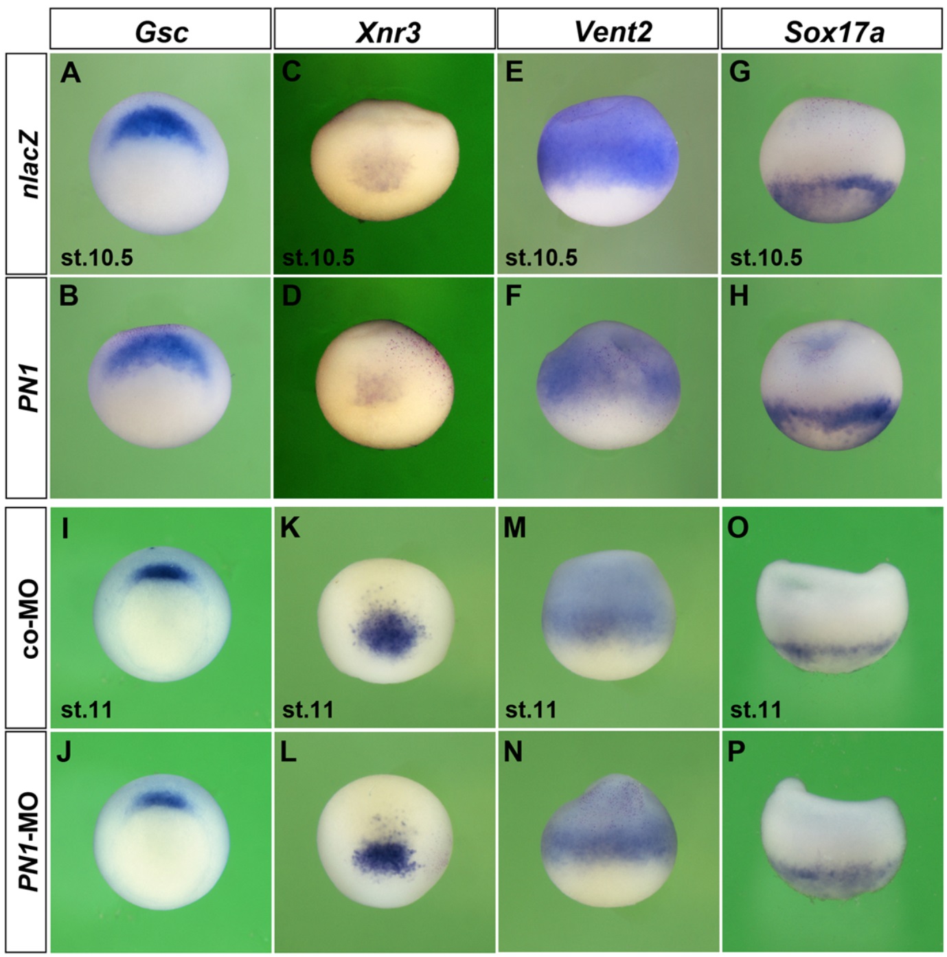 Figure S10. Overexpression or knockdown of PN1 does not affect expression of Gsc, Xnr3, Vent2, and Sox17a Whole-mount in situ hybridization of Xenopus embryos at early gastrula stage in vegetal (A,B,I,J) and lateral view (C-H, K-P). Embryos were injected into the margin (A-H) or animal pole (K-N) of a single blastomere at the 4-cell stage with nlacZ mRNA as lineage marker (red nuclei). Embryos in (I,J) were animally and in (O,P) marginally injected. Injected doses per embryo were: nlacZ mRNA (100 pg), PN1 mRNA (4 ng), MOs (15 ng in K-N; 60 ng in I,J,O,P). PN1-MO is an equal mixture of PN1.a-MO1, PN1.a-MO2, and PN1.b-MO. (A,B,I,J) Gsc expression in the dorsal mesoderm. (C,D,K,L) Xnr3 expression in the dorsal mesoderm. (E,F,M,N) Vent2 expression in the ventrolateral mesoderm and ventral ectoderm. (G,H,O,P) Sox17a expression in the endoderm. Indicated phenotypes were observed in A, 8/8; B, 15/15; C, 7/7; D, 8/8; E, 11/11; F, 14/19; G, 14/14; H, 25/25; I, 11/11; J, 15/15; K, 9/9; L, 10/10; M, 12/12; N, 18/18; O, 30/30; P, 26/26. |