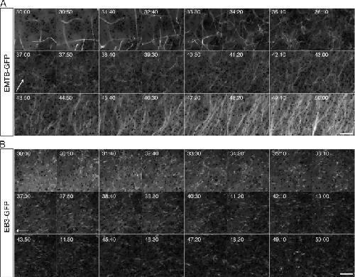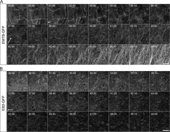 Fig. 3. Time lapse imaging of microtubule assembly and plus end orientation during cortical rotation in activated eggs. (A) Representative time-lapse imaging of a prick-activated egg injected with emtb-gfp mRNA (500 pg), or (B) with eb3-gfp mRNA (500 pg). Panels in (A) and (B) show selected frames at 50 s intervals from Video S3 and Video S4, respectively. Elapsed time from prick activation is shown at the top of each frame (in min:sec). Arrows indicate the frame of onset and approximate direction of relative movement of the yolk mass. Scale bars=10 μm. |