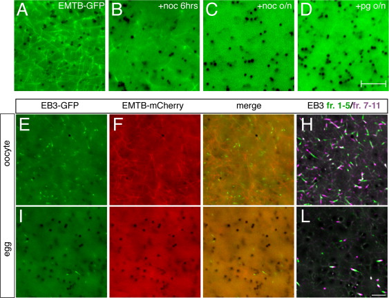 Fig. 1. Reduced cortical microtubule stability and plus end growth during the oocyte-to-egg transition. (AâD) Representative images of oocytes injected with emtb-3xgfp (500 pg; vegetal views). (A) Control untreated oocyte. (B) Oocyte treated with nocodozole (+noc, 3.3 nM) for six hours, or (C) overnight. (D) Oocyte treated with progesterone (+pg, 2 µM) overnight to induce oocyte maturation. (E-H) Oocytes or (I-L) eggs (progesterone-treated oocytes) injected with emtb-mCherry (500 pg) and eb3-gfp (500 pg) mRNAs. (H, L) Individual frames from time-lapse movies of co-injected oocytes and eggs demonstrating EB3-GFP dynamics ( Video S1 and Video S2). To facilitate visualization, frames 1â5 and 7â11 of each movie were averaged, merged and pseudo colored green and magenta respectively, representing 20 s of MT plus end growth. Dark structures are pigment granules. Scale bars represent 7.5 µm (AâD) and 5 µm (IâL). |