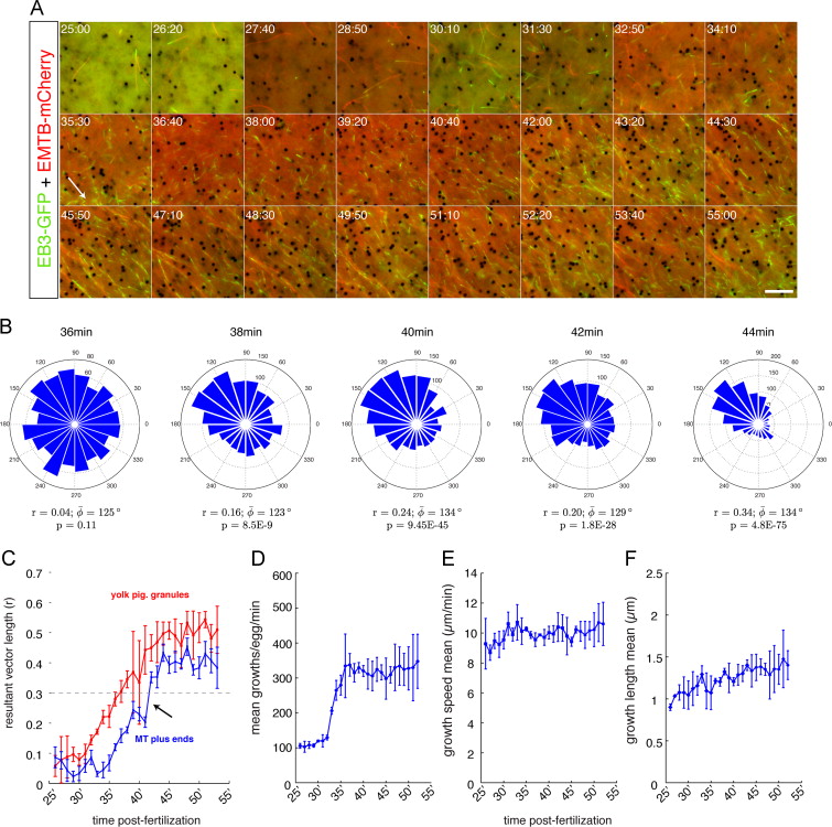 Fig. 6. Time lapse imaging of microtubule assembly and plus end orientation during cortical rotation in fertilized eggs. (A) Representative time-lapse imaging of a zygote obtained by the host-transfer procedure, previously injected as an oocyte with emtb-gfp mRNA (500 pg) and eb3-gfp mRNA (500 pg). Panels in (A) show selected frames at 80 s intervals from Supplementary Video 6 (30 min time-lapse, frame rate=2 s). Elapsed time from in vitro fertilization is shown at the top of each frame (in min:sec). The arrow indicates the frame of onset and approximate direction of relative movement of the yolk mass. Scale bar represents 5 μm. (B) Angle histogram plots showing the directionality of individual MT plus end tracks at selected times. Note differing scales. (C) Plots of the strength of directionally of MT plus ends (blue) and yolk pigment granules (red) during the onset of cortical rotation. Data points represent mean resultant vector length obtained from circular statistical analysis of one-minute windows. Brackets indicate standard deviation. (D-F) Plots of selected MT plus end growth parameters. N=four host-transferred eggs, derived from oocytes from two females. |