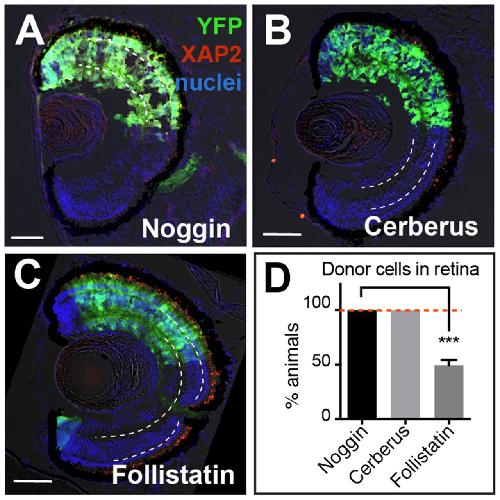 (AâC) YFP+ donor cells expressing Noggin, Cerberus, and Follistatin all contribute to the retina. However, Noggin- and Cerberus-treated cells formed retina in all animals while cells expressing Follistatin had a significantly lower retinal integration efficiency (D). On retinal sections, dashed white lines lie on outer and inner plexiform layers. Green, YFP donor cells; red, rod photoreceptor marker XAP2; blue, DAPI staining. YFP, 500â