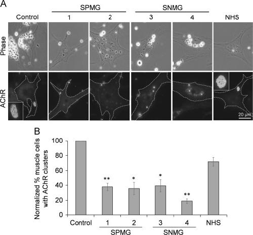 Fig. 1. Pathogenic effects of human MG patient plasma on the disassembly of aneural AChR clusters. (A) Representative images showing the effects of 4 different plasma samples from SPMG or SNMG patients on the maintenance of aneural AChR clusters in cultured Xenopus muscle cells. Normal human serum, NHS, was used as a negative control. The presence of aneural AChRs was observed in control and NHS-treated muscle cells, but not in the cells after a 4-h treatment of either SPMG or SNMG plasma samples. The periphery of muscle cells was identified in the phase contrast images and was outlined with white dotted lines in the fluorescence images for clarity. Insets showed the magnified view (3Ã) of the aneural AChR clusters in control and NHS-treated cells. Asterisks represent the non-specific auto-fluorescence signals caused by yolk granules inside the cells. (B) Quantification showing the percentage of cultured muscle cells with AChR clusters in response to human MG patient plasma. The presence of aneural AChR clusters in cultured muscle cells was scored after the 4-h treatment of SPMG or SNMG patient plasma. The respective percentage values were normalized with the untreated control. Data are represented as mean±SEM. âp<0.05, ââp<0.01, t test. N=250 muscle cells from 5 independent experiments in each condition.