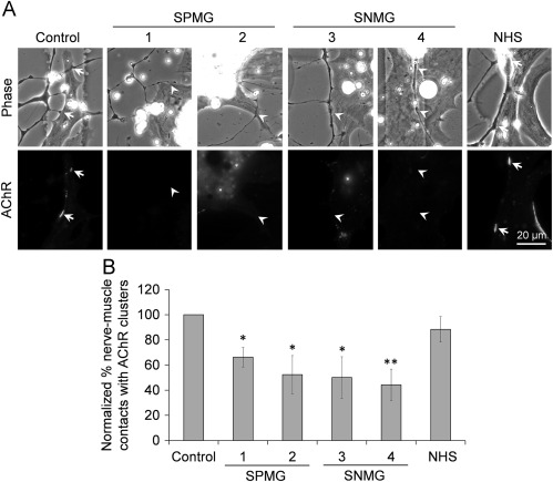 Fig. 3. Pathogenic effects of human MG patient plasma on the disassembly of nerve-induced AChR clusters. (A) Representative images showing the effects of 4 different plasma samples from SPMG or SNMG patients on the maintenance of synaptic AChR clusters in Xenopus nerveâmuscle co-cultures. NHS was used as a negative control. The presence of synaptic AChR clusters (arrows) was detected by Rh-BTX labeling at nerveâmuscle contacts in control and NHS-treated co-cultures, but not in the co-cultures after a 4-h treatment of either SPMG or SNMG plasma samples (arrowheads). Asterisks represent the non-specific auto-fluorescence signals caused by yolk granules inside the cells. (B) Quantification showing the percentage of nerveâmuscle contacts with AChR clusters in response to human MG patient plasma. The presence of synaptic AChR clusters in cultured muscle cells was scored after the 4-h treatment of SPMG or SNMG patient plasma. The respective percentage values were normalized with the untreated control. Data are represented as mean±SEM. âp<0.05, ââp<0.01, t test. N=142 (control), 30 (patient 1), 42 (patient 2), 74 (patient 3), 32 (patient 4), and 53 (NHS) from 6 independent experiments.