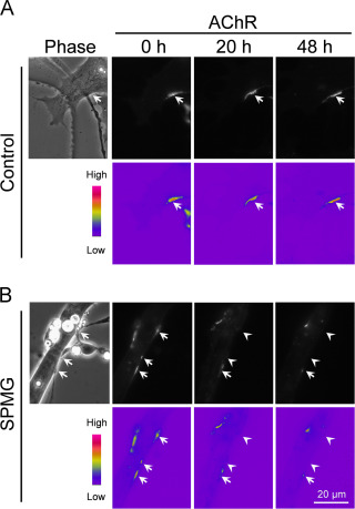 Fig. 4. Time-lapse imaging on the disassembly of nerve-induced AChR clusters by MG patient plasma. (A) and (B) Representative sets of time-lapse images showing the effects of the SPMG patient plasma on the maintenance of synaptic AChR clusters in Xenopus nerveâmuscle co-cultures. The same AChR clusters at nerveâmuscle contacts were followed over a period of 48 h in the absence (A) or presence (B) of the SPMG plasma. The nerve-induced synaptic AChR clusters remained stable throughout the entire imaging period in the control co-culture (A, arrows), while a gradual disappearance of the nerve-induced AChR clusters was observed in the SPMG plasma-treated co-culture (B, arrows changed to arrowheads). To better depict the change in fluorescence intensity of AChR clusters, 8-bit pseudo-colored images were shown in the bottom panels for each condition.