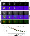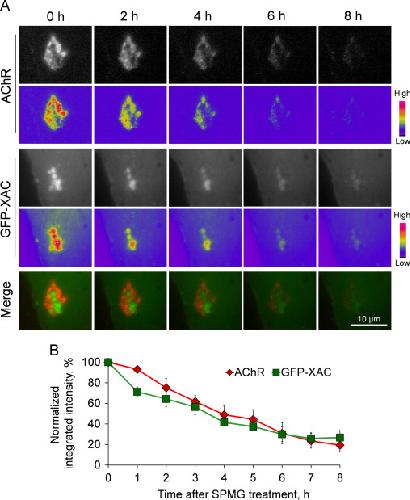 Fig. 5. Spatio-temporal correlation between AChR cluster disassembly and ADF/cofilin localization. (A) A representative series of time-lapse images showing the correlation between the disassembly of aneural AChR clusters and ADF/cofilin localization induced by the SPMG plasma treatment in Xenopus muscle cultures. To clearly depict the change in fluorescence intensity of AChR and GFPâXAC, 8-bit pseudo-colored images were showed in the bottom panels for each marker. The spatial correlation between AChR (red) and GFPâXAC (green) was shown in the merged color images in the bottom row. (B) Quantitative analysis showing the temporal change in the integrated intensity of AChR and GFPâXAC fluorescence signals in response to the SPMG plasma treatment. The respective intensities were normalized with their integrated intensity values at 0 h. N=3. Data are represented as mean±SEM.