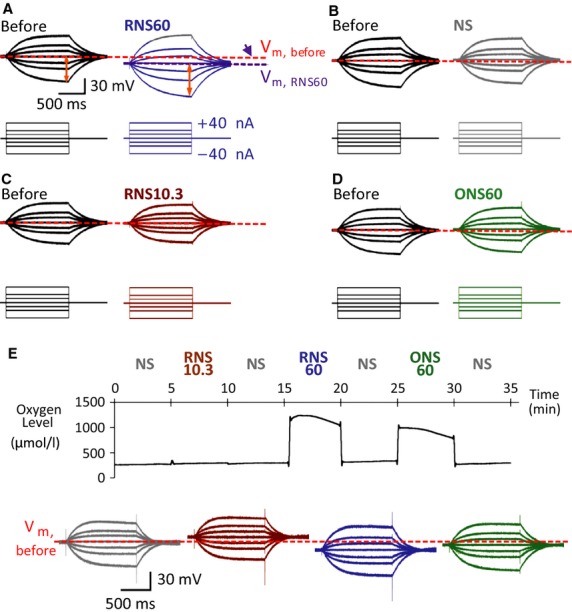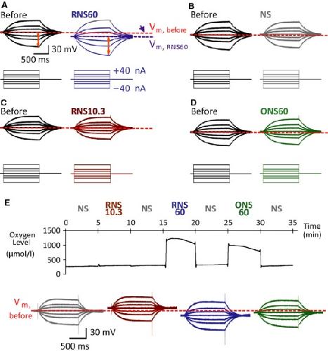 Figure 1. Intracellular recordings from Xenopus laevis oocytes in the presence of RNS60- (A), NS- (B), RNS10.3- (C), and ONS60- (D)-based Ringer's solutions. Note that solutions based on RNS60, but not those based on normal saline (NS), RNS10.3 (TCP-modified saline without excess oxygen), or ONS60 (saline containing comparable level of oxygen without TCP modification), increased (hyperpolarized) resting membrane potential. Also, step pulse transmembrane current injection-induced membrane potential changes were increased only in the presence of RNS60. (E) Intracellular recording with serial applications of NS, RNS10.3, RNS60, or ONS60 with measurement of oxygen level in recording solutions.