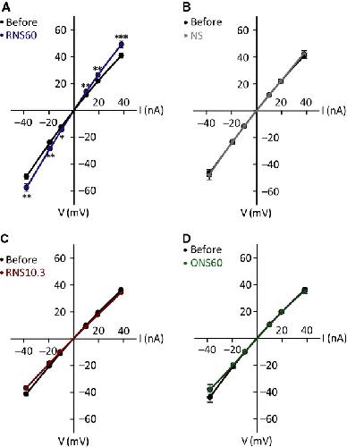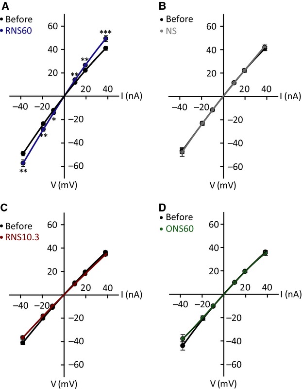 Figure 2. Membrane potential changes as a function of current injection (I–V curve) in the presence of RNS60 (A, average of 16 experiments), NS (B, average of 13 experiments), RNS10.3 (C, 14 experiments) and ONS60 (D, 10 experiments). *P < 0.05, **P < 0.01 and ***P < 0.001 two-way ANOVA/Tukey's post-hoc test.