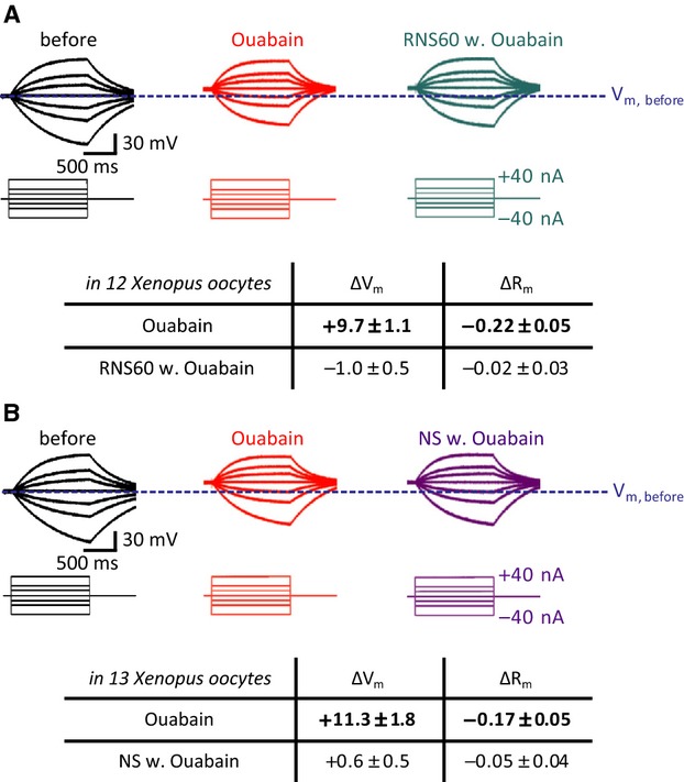 Figure 3. RNS60 effect on Xenopus laevis oocyte membrane potential and input resistance following ouabain Na+/K+ ATPs block. In (A) Control, left set of recordings (in black), resting potential and input resistance recordings before ouabain administration. In red similar set of recordings 10 min following 100 μmol/L ouabain administration. The oocyte resting potential was reduced by nearly 10 mV (P < 0.001 by paired t-test). In addition, a significant decrease in membrane input resistance was also registered (P < 0.05 by paired t-test). In green, following ouabain addition of RNS60 did not modify X. laevis oocyte resting potential or membrane resistance (results from 13 different oocyte experiments). In (B) a similar set of recordings as in (A). The last set in purple demonstrates no change of membrane properties in normal saline solution with ouabain (results from 10 different oocyte experiments).