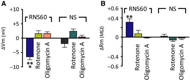Figure 4. Effects of RNS60 on membrane potential (A) and membrane input resistance (B) following block of intracellular “usable ATP” inhibition. Note that RNS60 effect is absent after both the inhibition of electron transport chain in mitochondria by rotenone and after oligomycin A, an inhibitor of ATP synthase. **P < 0.01 and ***P < 0.001 by paired t-test, indicating that the target for RNS60 action is mitochondrial ATP synthesis (n = 7 in RNS60 with rotenone, 6 in RNS60 with oligomycin A, 8 in NS with rotenone, and 6 in NS with oligomycin A).