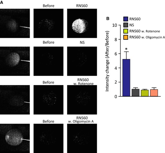 Figure 5. Intracellular ATP levels determined by luciferin/luciferase photon emission in Xenopus laevis oocytes. ATP levels increased 5 min following RNS60-based Ringer's superfusion, but not so following RNS-based Riger's with intracellular ATP blockages (with rotenone and oligomycin A) as well as NS-based Ringer's superfusion (A). Photon ATP images were obtained by photon accumulation for 1 min. Scale bar = 0.5 mm. Statistical difference is shown in (B). *P < 0.05 by one-way ANOVA. (n = 8 in RNS60, 6 in NS, 4 in RNS60 with rotenone, and 5 in RNS60 with oligomycin A).
