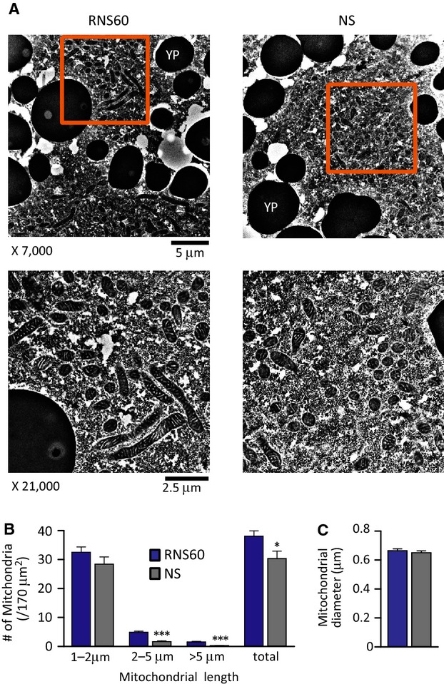 Figure 6. Ultrastructural analysis of mitochondria in response to RNS60-based Ringer's, compared to air oxygenated standard NS-based Ringer's. (A) Electron microscopy of cortical cytoplasm in Xenopus laevis oocytes. (B) The increased number of longer length mitochondria in response to RNS60. Total 36 areas (area size: 170 μm2, 6 areas per X. laevis oocyte) in cortical cytoplasm were analyzed in each group, YP: light yolk platelet. (C) The comparison of averaged mitochondrial diameter. Statistically significant differences marked as *P < 0.05 and ***P < 0.001 by one-way ANOVA.