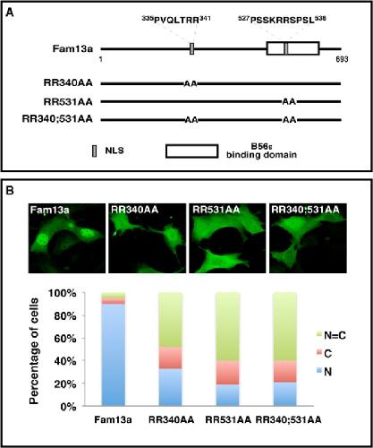Regulation of nuclear-cytoplasmic shuttling and function of Family with sequence similarity 13, member A (Fam13a), by B56-containing PP2As and Akt.