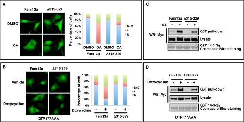 FIGURE 4:. The 14-3-3 binding domain is important for cytoplasmic sequestration of Fam13a in response to PP2A inhibition. (A) Representative immunofluorescence images, showing the subcellular distribution of Fam13a and Δ315–329 in control (DMSO) and OA-treated NIH3T3 cells. Fam13a and Δ315–329 were primarily nuclear in control (DMSO) NIH3T3 cells. OA treatment induced cytoplasmic localization of Fam13a. Δ315–329 remained nuclear in the majority of OA-treated cells. (B) Representative immunofluorescence images, showing subcellular distribution of Fam13a and Δ315–329 in control (vehicle-treated) and doxycycline-treated Aα exchange (DTP177AAA) cells. Fam13a and Δ315–329 were nuclear in vehicle-treated cells. After doxycycline treatment, Fam13a was mislocalized. Δ315–329 remained nuclear in the majority of treated cells. Bar graphs in A and B indicate the percentage of cells that exhibit nuclear, cytoplasmic, or homogeneous subcellular distribution. (C) The 14-3-3 binding motif (residues 315–329) is required for the effect of PP2A inhibition on binding between Fam13a and bacterially expressed GST–14-3-3η in a GST pull-down assay. Fam13a- and Δ315–329–expressing cells were treated with DMSO or OA. Cell lysates were used for the GST pull-down assay. Note that OA treatment significantly enhanced interaction between Fam13a and GST–14-3-3. Compared to wild-type Fam13a, Δ315-329 showed much weaker interaction with 14-3-3 after OA treatment. (D) The 14-3-3 binding motif (residues 315–329) is required for the effect of B56s knockdown on binding between Fam13a and GST–14-3-3 in a GST pull-down assay. Fam13a- and Δ315–329–expressing Aα exchange cells were treated with vehicle or doxycycline. Cell lysates were used in a GST pull-down assay. Doxycycline treatment significantly enhanced the interaction between Fam13a and 14-3-3. However, Δ315–329 showed weaker interaction with 14-3-3 compared with wild-type Fam13a after doxycycline treatment. |
