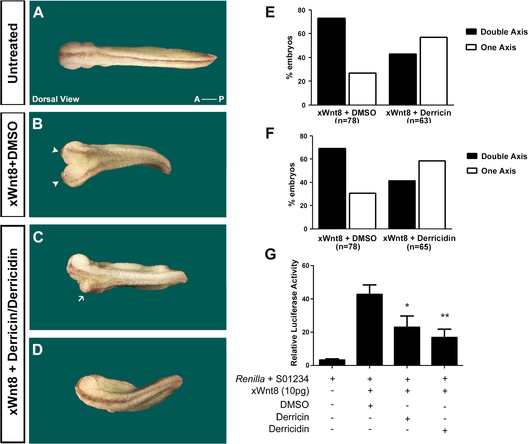 Fig 7. Derricin and derricidin inhibit double axis formation in Xenopus embryos and suppress Wnt/β-catenin luciferase reporter activity in vivo. |
