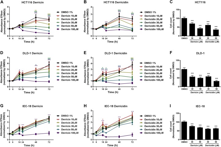 Fig 2. Derricin and derricidin reduce cell number and cell viability of colon cells.(A, B, D, E, G, H) Graphs show MTT absorbance levels in HCT116, DLD-1 and IEC-18 cell lines, after treatment up to 72 h with 10–100 μM of derricin or derricidin. (A) In HCT116 cells, it is observed significant reduction in cell viability after 100 μM of derricin for 24 h and 20 μM of derricin for 48 h (B) After derricidin treatment, reduction of cell viability occurred at 100 μM of derricidin after 24 h and at 30 μM after 72 h. (D) In DLD-1 cells, it is observed a milder effect at 100 μM after 18h of treatment. Otherwise, an intense reduction of MTT absorbance is detected after 48h treatment with 100 μM of derricin. (E) Derricidin treatment significantly reduces DLD-1 cell viability after 18h treatment with 50 μM of flavonoid and at 20 μM after 72h. (G) In IEC-18 cells, reduction of viability is observed with 100 μM of derricin, starting at 18h of treatment. (H) A similar profile is observed after derricidin treatment. (C,F,I) DAPI-stained nuclei were counted after 24h treatment with derricin and derricidin. (C) 30 and 50μM of derricin reduced approximately 30% and 58% the number of HCT116 nuclei, respectively; while derricidin reduced approximately 39% and 65%, respectively. (F) DLD-1 nuclei were decreased about 44% and 50% after derricin treatment at 30 and 50 μM concentrations, respectively. Derricidin treatment diminished about 50% and 70%, respectively. (I) IEC-18 nuclei were also decreased, with values of 25% and 32% of reduction with 30 and 50μM of derricin, respectively, and 40% and 38% with 30 and 50μM of derricidin, respectively. * p<0.05, **p<0.01, ***p<0.001. |