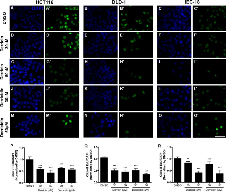 Fig 3. Derricin and derricidin inhibit cell proliferation of HCT116, DLD-1 and IEC-18 cells.Edu incorporation in colon cells after treatment with 30 and 50μM of derricin and derricidin for 24h. (A,A’,B,B’,C,C’) In control conditions, it is observed a considerable number of Edu-positive cells. (D,D’,E,E’,F,F’,G,G’,H,H’,I,I’) After treatment with derricin, it is observed a lower number of Edu-positive cells. (J,J’,K,K’,L,L’,M,M’,N,N’,O,O’) Derricidin treatment also reduces Edu-positive cells. (P,Q,R) Quantification of Edu-positive cells in HCT116, DLD-1 and IEC-18. Scale bar 50 μm, **p<0.01, ***p<0.001. |