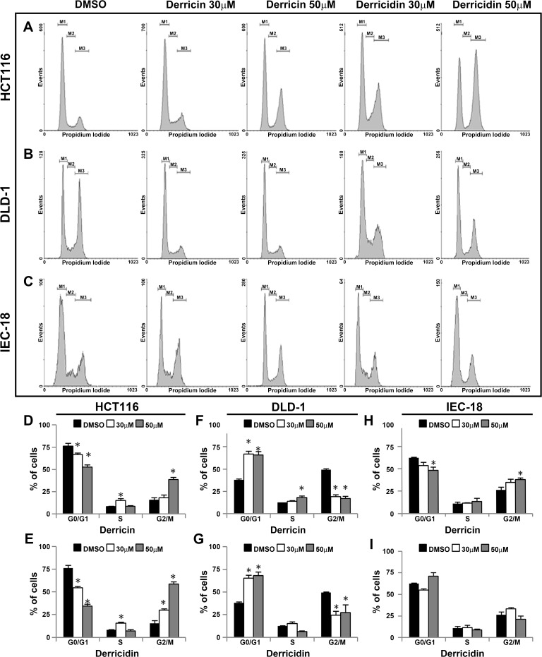 Fig 4. Derricin and derricidin induced cell cycle arrest in CRC cells.(A, D, E) In HCT116, untreated cells showed approximately 75% of cells in G1/G0 phase, while 30 and 50 μM of derricin reduced this proportion to 67.6% and 54%, respectively, resulting in cell cycle arrest in S and G2/M phases, respectively. Derricidin reduced this proportion to 53.8% and 35.5%, respectively and also induced cell cycle arrest in G2/M phase. (B, F,G) On the other hand, DLD-1 cells accumulated in G0/G1 phase of cell cycle after 30 μM and 50 μM of derricin or derricidin. (C, H, I) Derricin and derricidin treatment had milder effects in cell cycle progression of IEC-18 cells, except for a slightly arrest at G2/M with 50 μM of derricin. Bar graphs represent the percentage of cells according treatment and significant data were represented in the figure. Black bars: G0/G1 phase; White bars: S phase; and Gray bars: G2/M phases. |